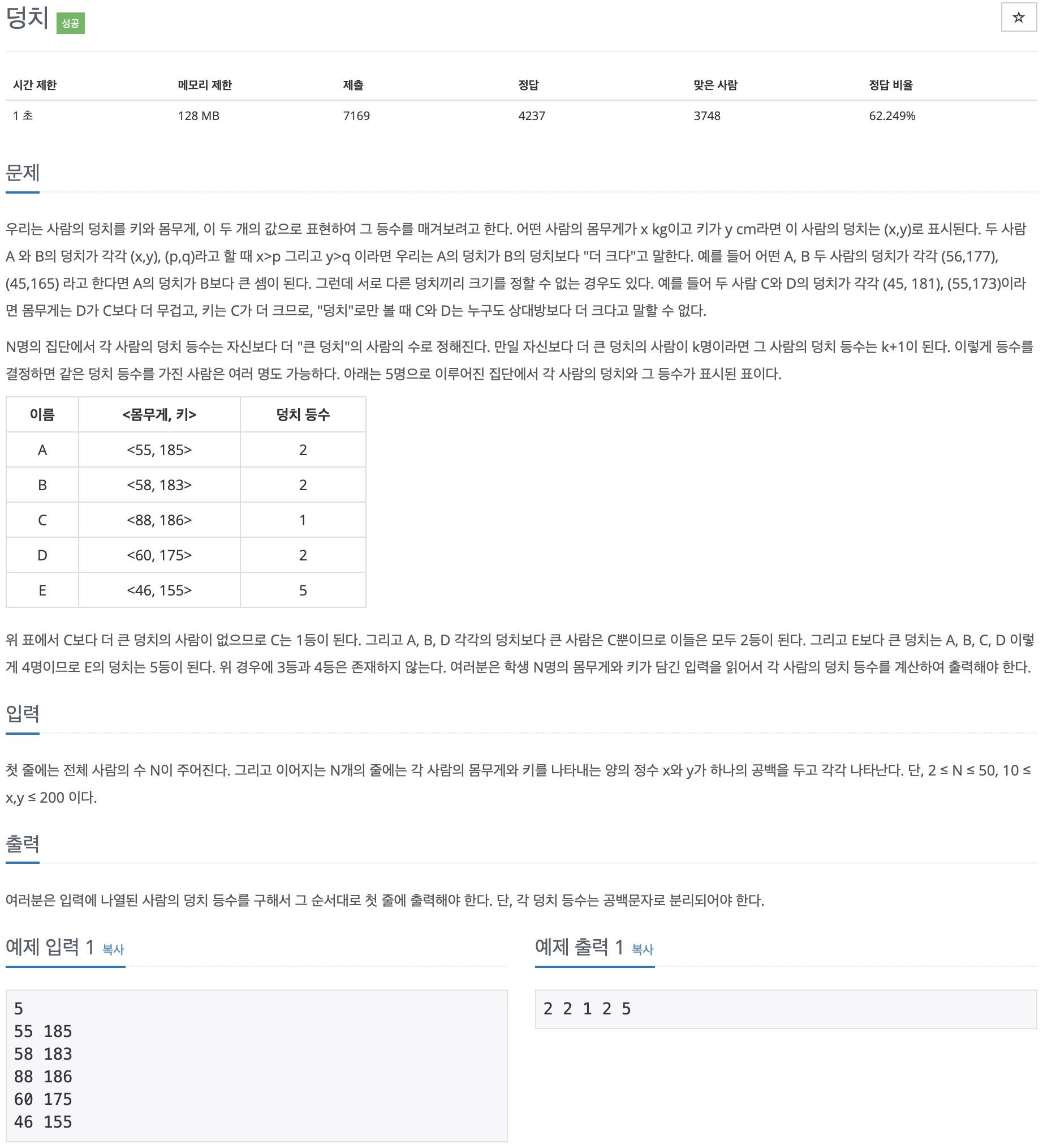 기수 정렬(Radix Sort)로 시도해보다가, 기수 정렬은 기수간 우선순위가 있기에 본 문제와는 적합하지 않다는 것을 알았다. 다시 말해 이 문제는 그냥 자기보다 크고 무거운(둘 다 큰) 사람이 몇 명인지 쟤서 자기 등수만 정하면 된다. n명을 n-1번씩 전수 비교해보면 된다.