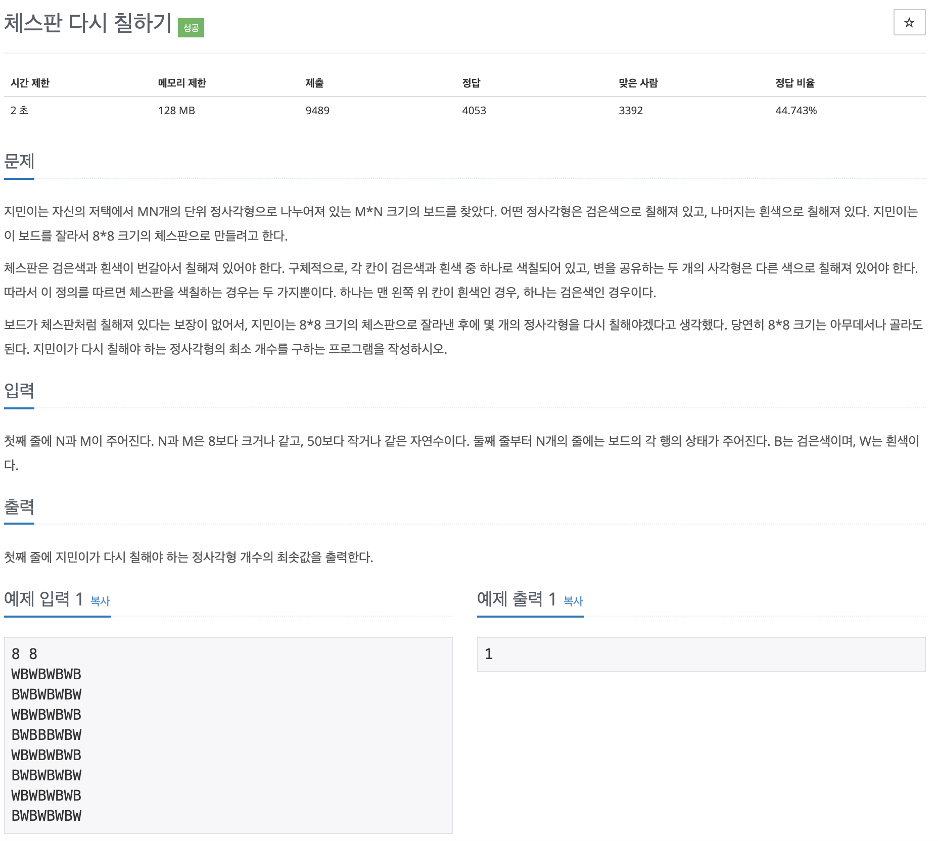 BW와 WB판으로 나누어서 풀어야한다는 힌트가 주어졌다. 각각의 판을 전부 BW 혹은 WB로 바꾼 뒤, 가상의 체스판에 1을 넣어준다. 8x8 전수 조사를 통해서 1이 가장 적은 부분을 찾아낸다.