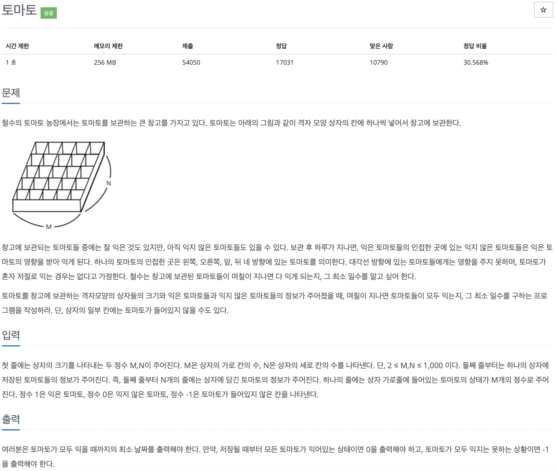 queue.append([i, j]) #이미 익어있는 토마토 위치를 큐에 넣어줌