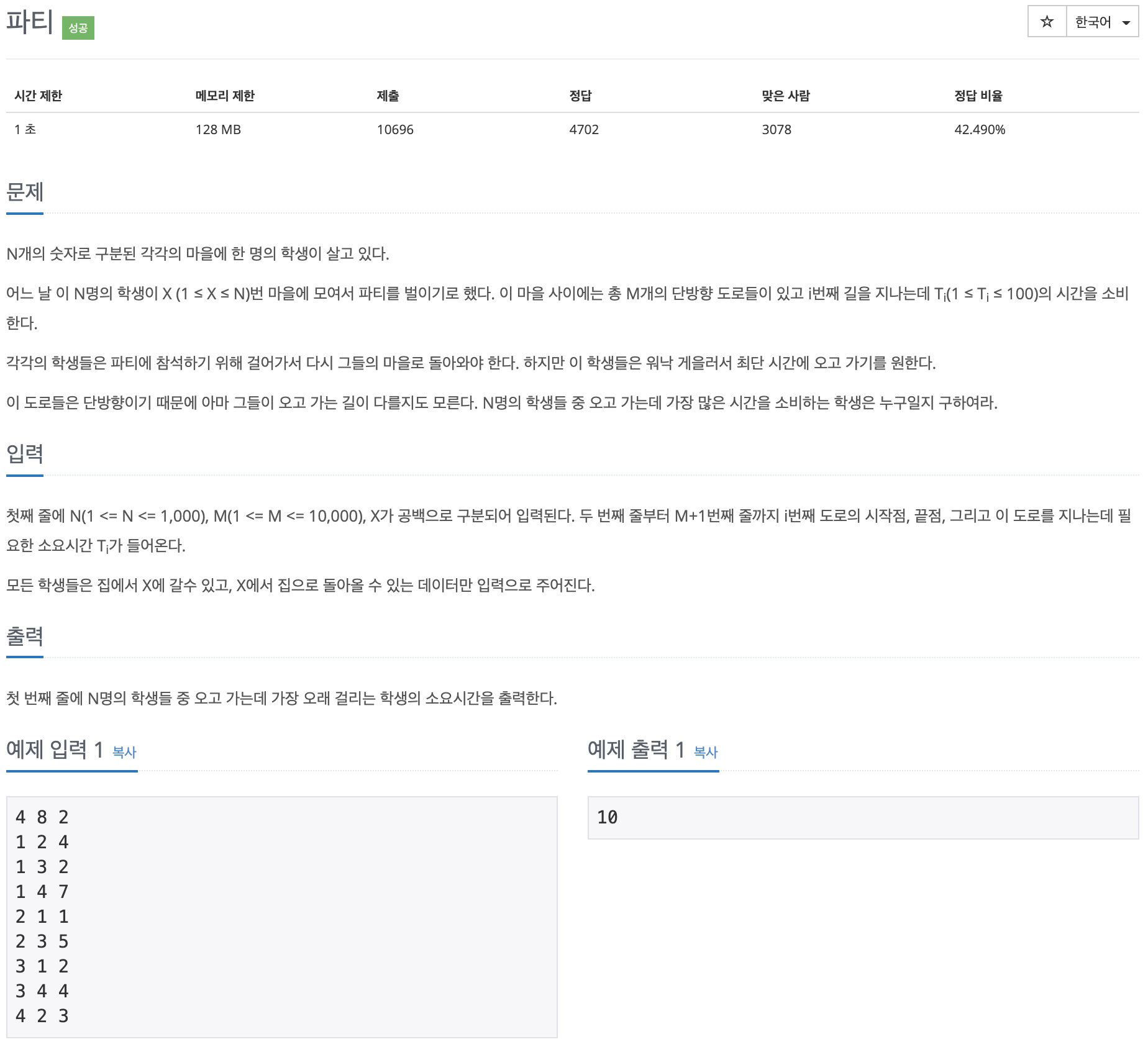 플로이드 와샬 알고리즘으로 풀 수 있는 문제. 다익스트라 알고리즘으로도 풀 수 있지만, pypy로 컴파일 해가면서 까지기어코 플로이드 와샬로 풀었다.