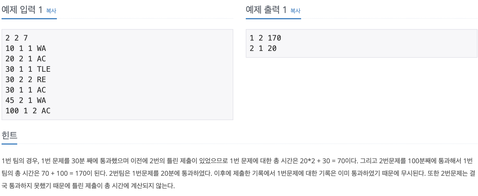 acm_icpc[team][prob][0] = time #최소 정답 시간