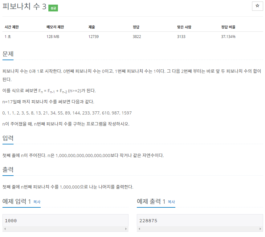 행렬을 이용한 방법으로 빠르게 피보나치 수를 구해주었다.
