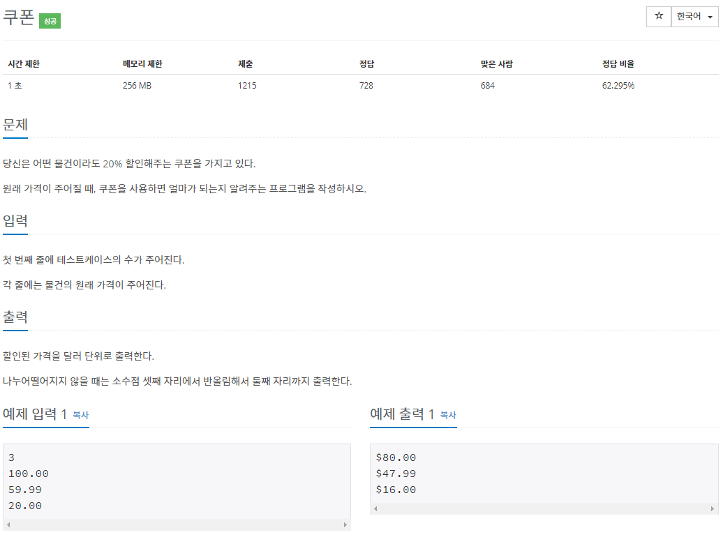 print("$%.02f" % round(float(input()) * 0.8, 2))'Programming [Python] > 백준 알고리즘 솔루션' 카테고리의 다른 글