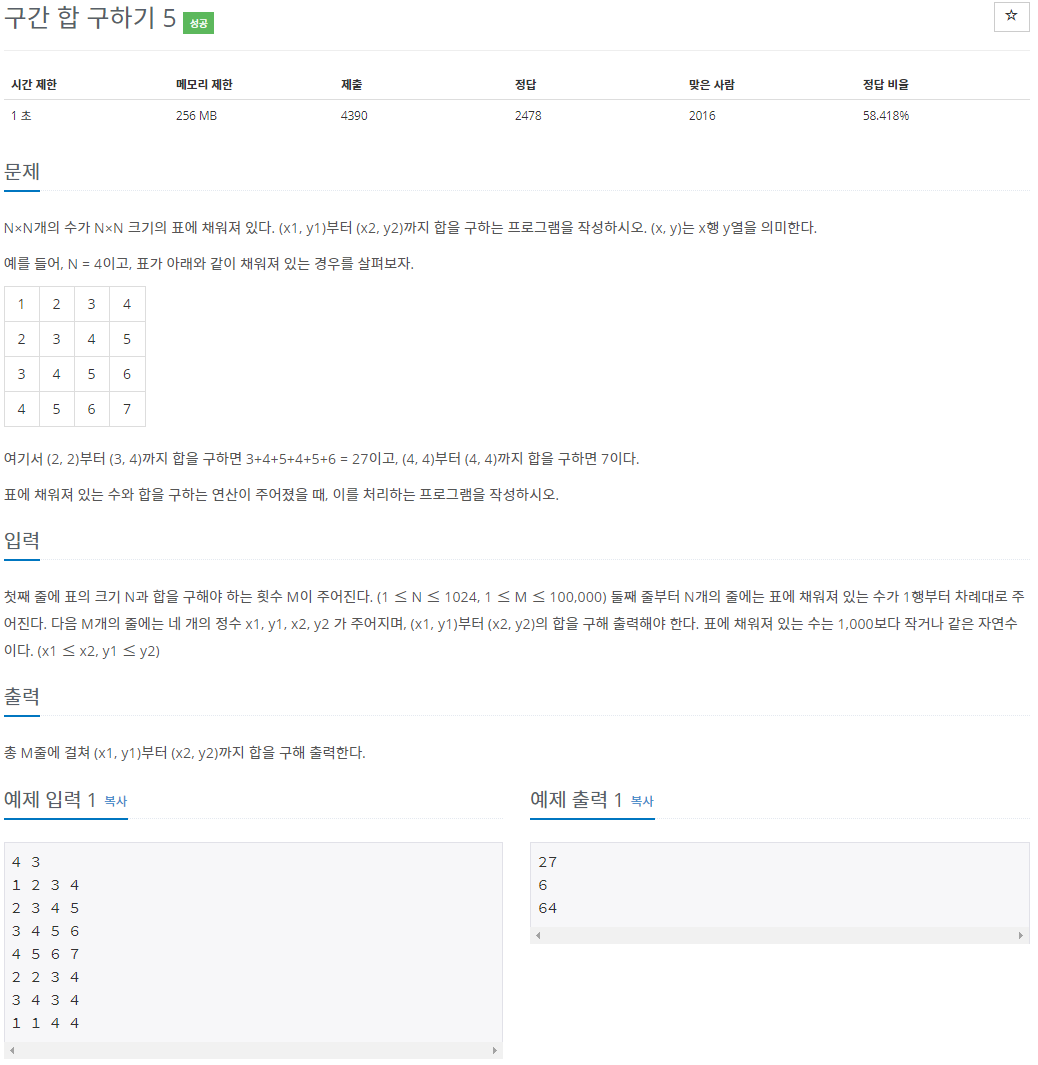 1행 1열부터 x행 y열까지의 sum을 한 번에 구해놓고 sum_matrix 리스트에 저장한 뒤 더하기와 빼기로 구하는 방법을 활용한다. 1차원 배열을 DP로 구하는 것과 똑같다.