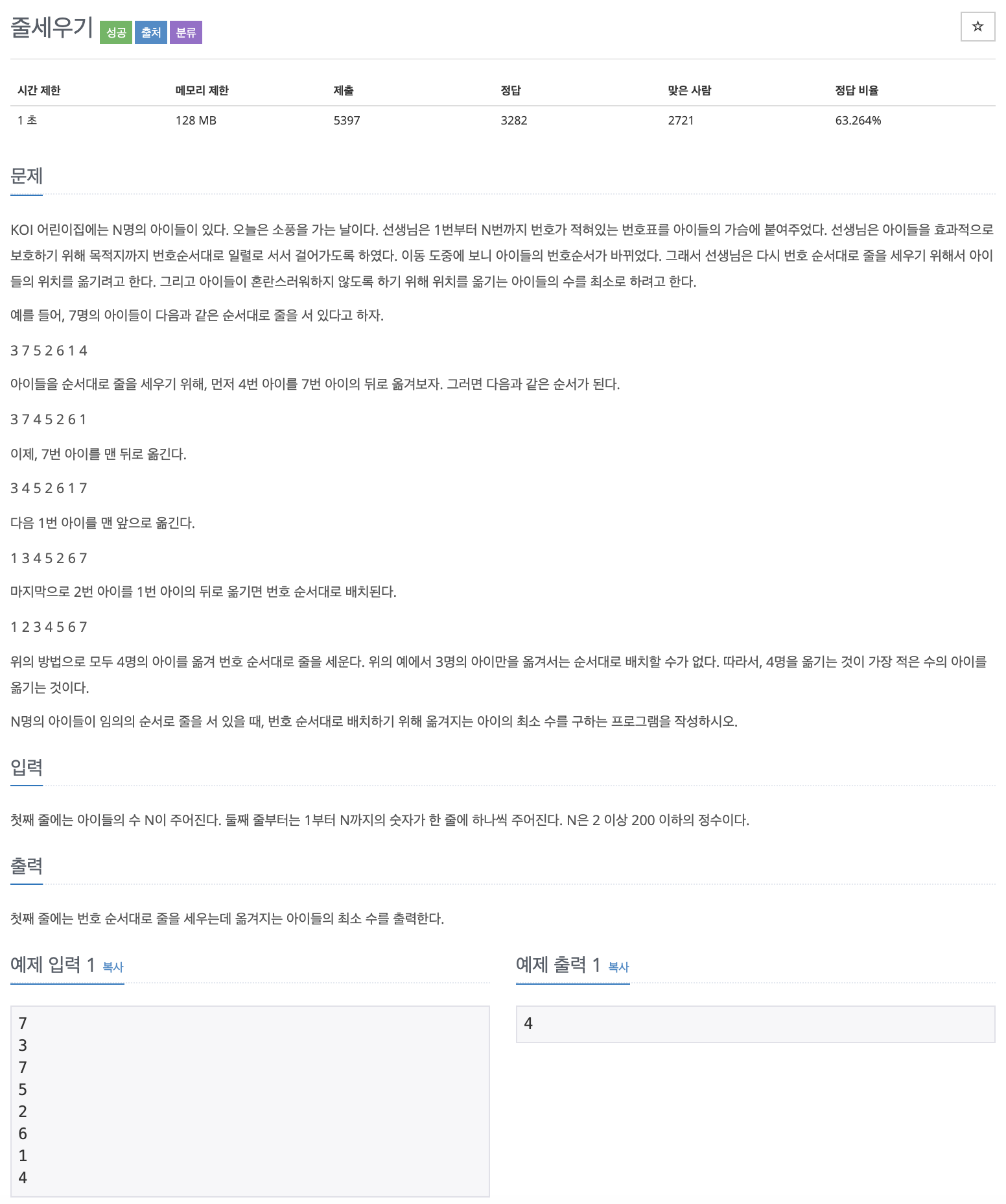 최장 증가 부분 수열 (LIS : Longest Increasing Subsequence)문제이다.