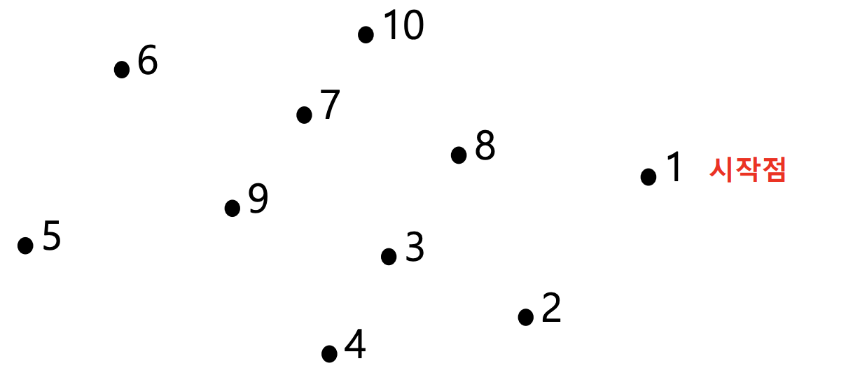 시작점 부터 모든 선분을 한 번만 지나서 출발점으로 돌아오는 방법은? 선분은 겹치면 안되지만 점을 겹쳐도된다.